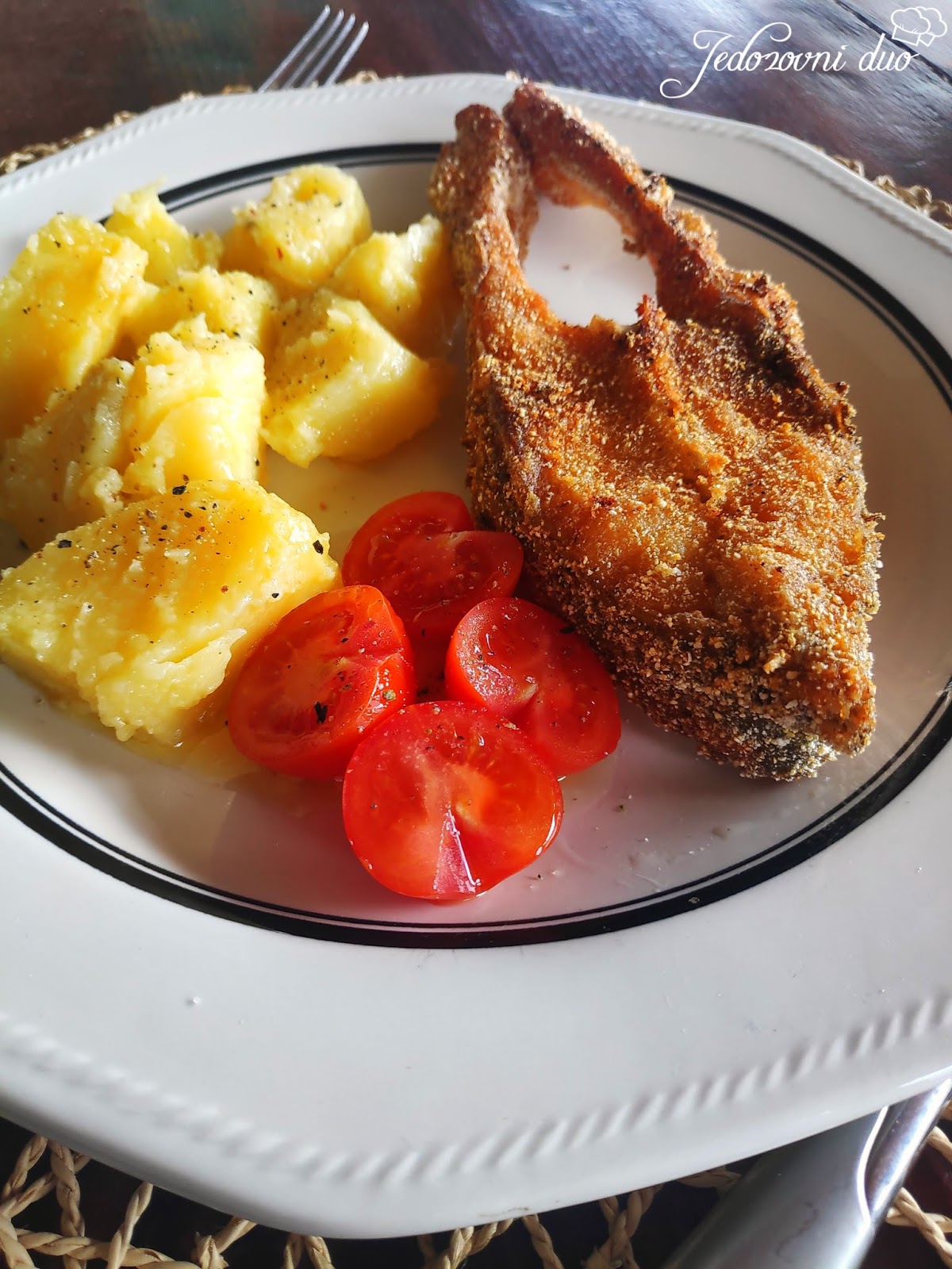 Pomiješajte kukuruzno brašno i palentu, dobro uvaljajte sve odreske. Zagrijte mast i ulje i prepecite ribu, sa svake strane nekoliko minuta, da pozlati. Poslužite uz prilog po želji. Ja sam skuhala krumpir koji sam poslužila s maslacem i češnjakom te malo svježe mljevenog papra.