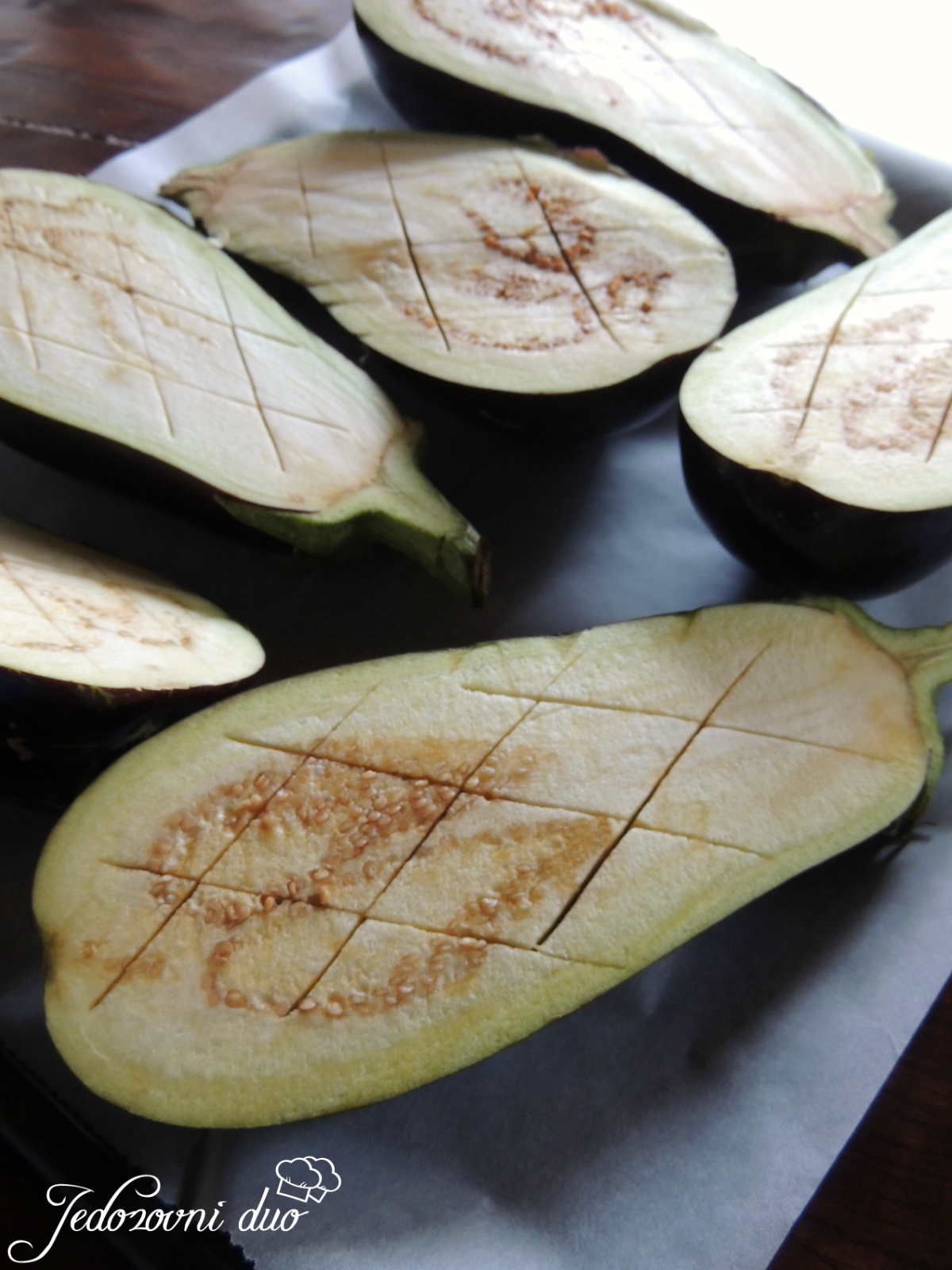 Patlidžane prepolovite i nožem zarežite rešetku. Premažite maslinovim uljem, posolite. Pecite u pećnici zagrijanoj na 180C dok ne omekšaju, oko 40 minuta. Ohladite.