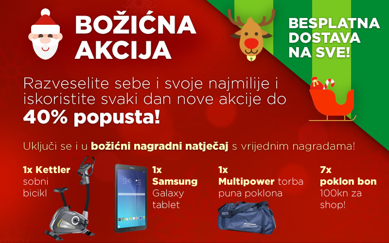 Fitness.com.hr webshop je najveća internetska trgovina specijalizirana za fitness opremu i dodatke prehrani u Hrvatskoj, a u našem asortimanu možeš pronaći sve za svoj trening, prehranu, suplementaciju bez obzira jesi početnik ili profesionalni sportaš. Iskoristi prosinac i za svaku kupnju u našem webshopu ćeš dobiti besplatnu dostavu!