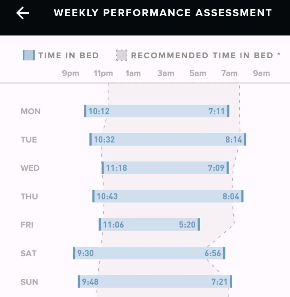 Ako vas zanima kako spavate posljednjih tjedan ili mjesec dana onda pogledate na aplikaciji grafikon koji vam uspoređuje vaš san s vašim idealnim programiranim snom. Onda to izgleda kao slika ispod s naslovom “Weekly Performance Assessment” gdje vam je plavom označeni stvarni san koji ste imali a siva pruga vam daje idealni programirani san. Tada možete usporediti gdje griješite ili suprotno - što radite dobro.