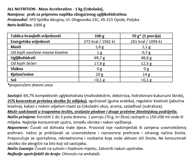 Mass Acceleration je vrhunska mješavina proteina i ugljikohidrata odličnog okusa za povećanje tjelesne mase.