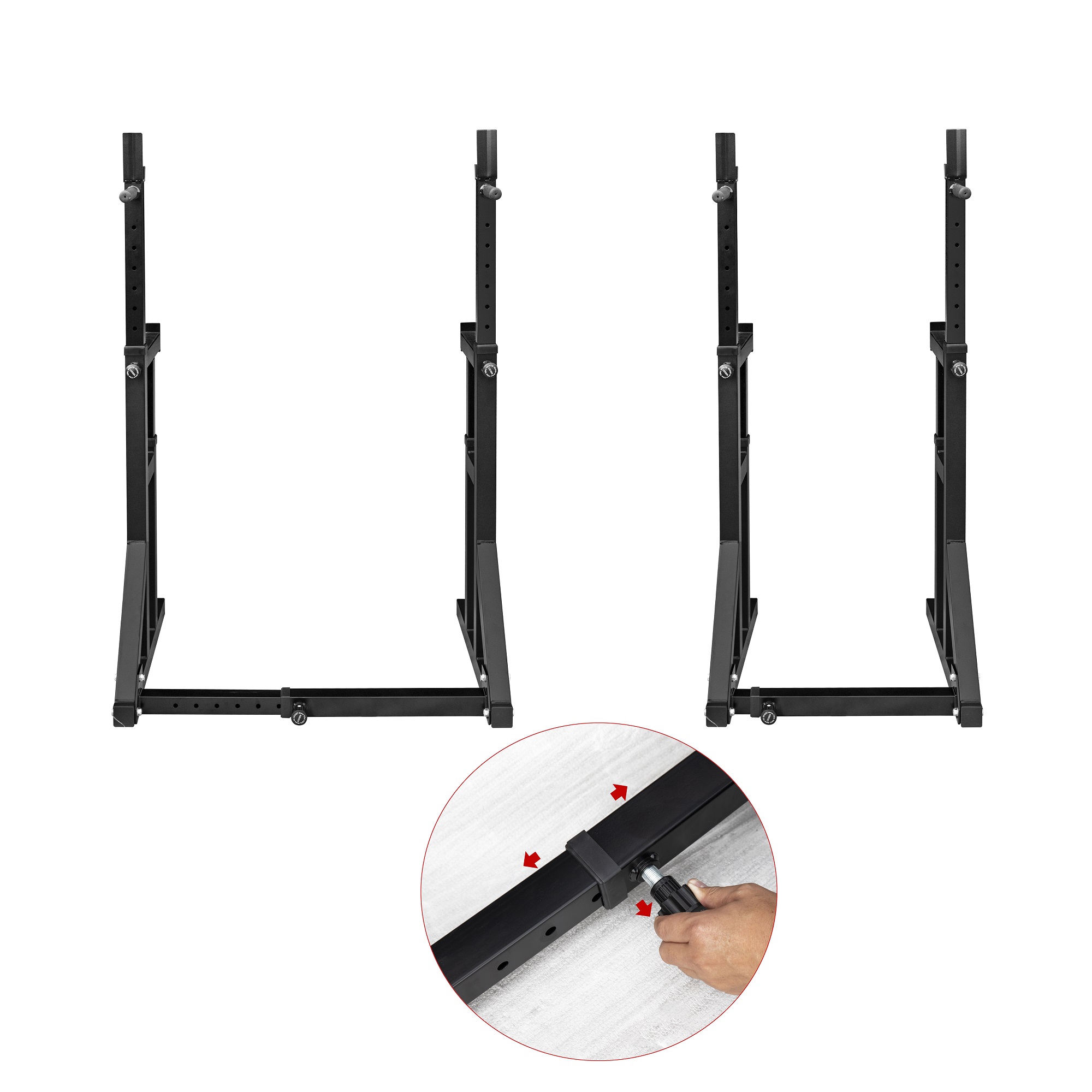 Širina nosača može se podesiti kako bi odgovarala svakoj dužini šipke, a uz nosače podesive po visini možete učinkovito i sigurno izvoditi gotovo sve osnovne vježbe poput čučnjeva, bench pressa, itd. Nosač se može koristiti sa standardnim i olimpijskim šipkama.