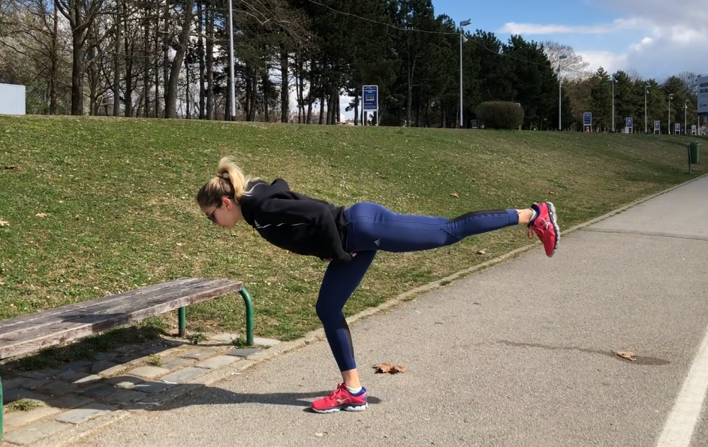Iz stojeće pozicije na jednoj nozi kukove gurnuti prema natrag, a trup postaviti u pretklon (hip hinge). Druga je noga u produžetku trupa, a pogled je u donjoj poziciji usmjeren u pod. U ovom pokretu pogrčiti se i u zglobu koljena, ali najviše u zglobu kuka.