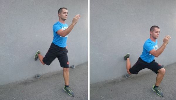 Iskorak je jedna kompletna vježba. Skoro svi mišići donjeg dijela trupa su uključeni u rad. Jedan od načina da ih malo otežamo (bez vanjskog opterećenja) je da stavimo nogu na povišenje ili, u ovom slučaju, oslonimo o zid. Time će se dodatno istegnuti mišići natkoljenice i mišići pregibači u zglobu kuka kod stražnje noge i stavit će se dodatno opterećenje na prednju nogu. Napravimo određeni broj ponavljanja jednom nogom pa ponovimo drugom.