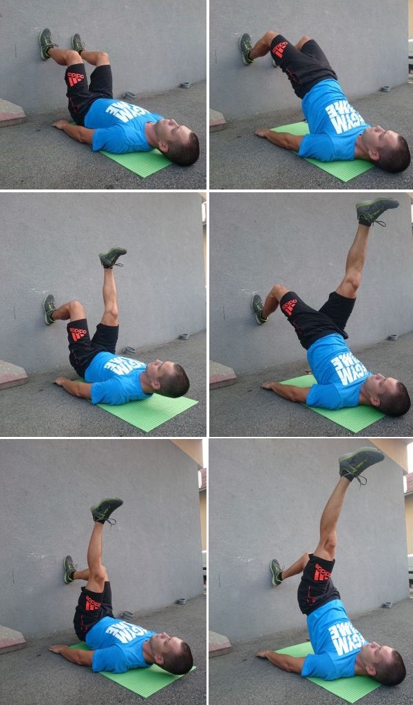 Lezite na leđima, noge su odignute od podloge, a ruke su uz tijelo. Iz tog položaja krećete npr. s desnom nogom i dižete je u okomit položaj i tu je zadržite. Zatim joj pridružite i lijevu nogu. Nakon toga desnu nogu spustite dok zadržavate lijevu gore i tek nakon što spustite desnu za njom ide lijeva. Znači D-L-D-L. Cijeli ciklus čini jedno ponavljanje. Jako dobra i efikasna vježba za trbušne mišiće.