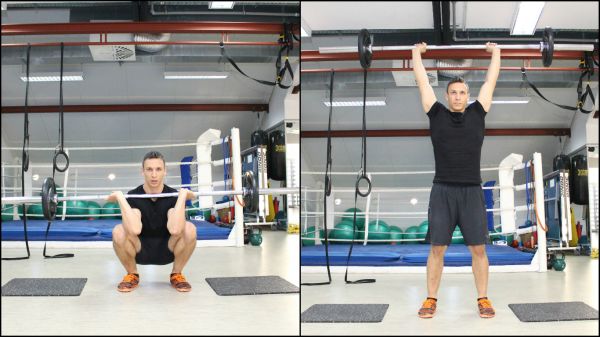 Iz stojećeg stava spustite se u čučanj. Podignite se i bez zastoja potisnite šipku iznad glave. Pokret mora biti kontinuiran i bez prekida. Vježba se ponavlja 10 puta.