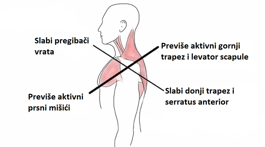 Prsni mišići na prednjoj strani i gornji trapez i levator scapule na stražnjoj strani tijela su preaktivni, dok su pregibači vrata i rhomboideus serratus anterior neaktivni.