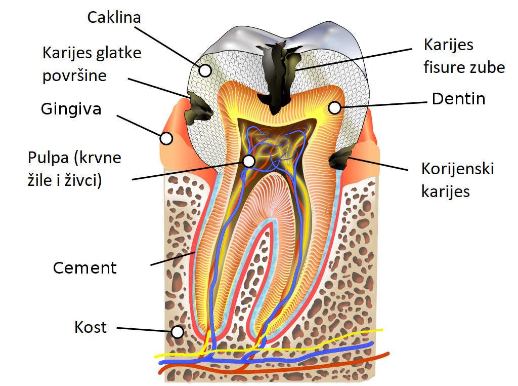 Dakle, karijes napada prvo zubnu caklinu, a ako u tom stadiju bolesti ne bude uklonjen, razvojem će značajnije izazvati oštećenje zube, što može rezultirati propadanjem živca i korijena zuba. Stoga, upravo su redovni pregledi stomatologa iznimno bitni da se karijes otkrije u što ranijoj fazi i spriječi ozbiljnije propadanje i uništavanje zuba.